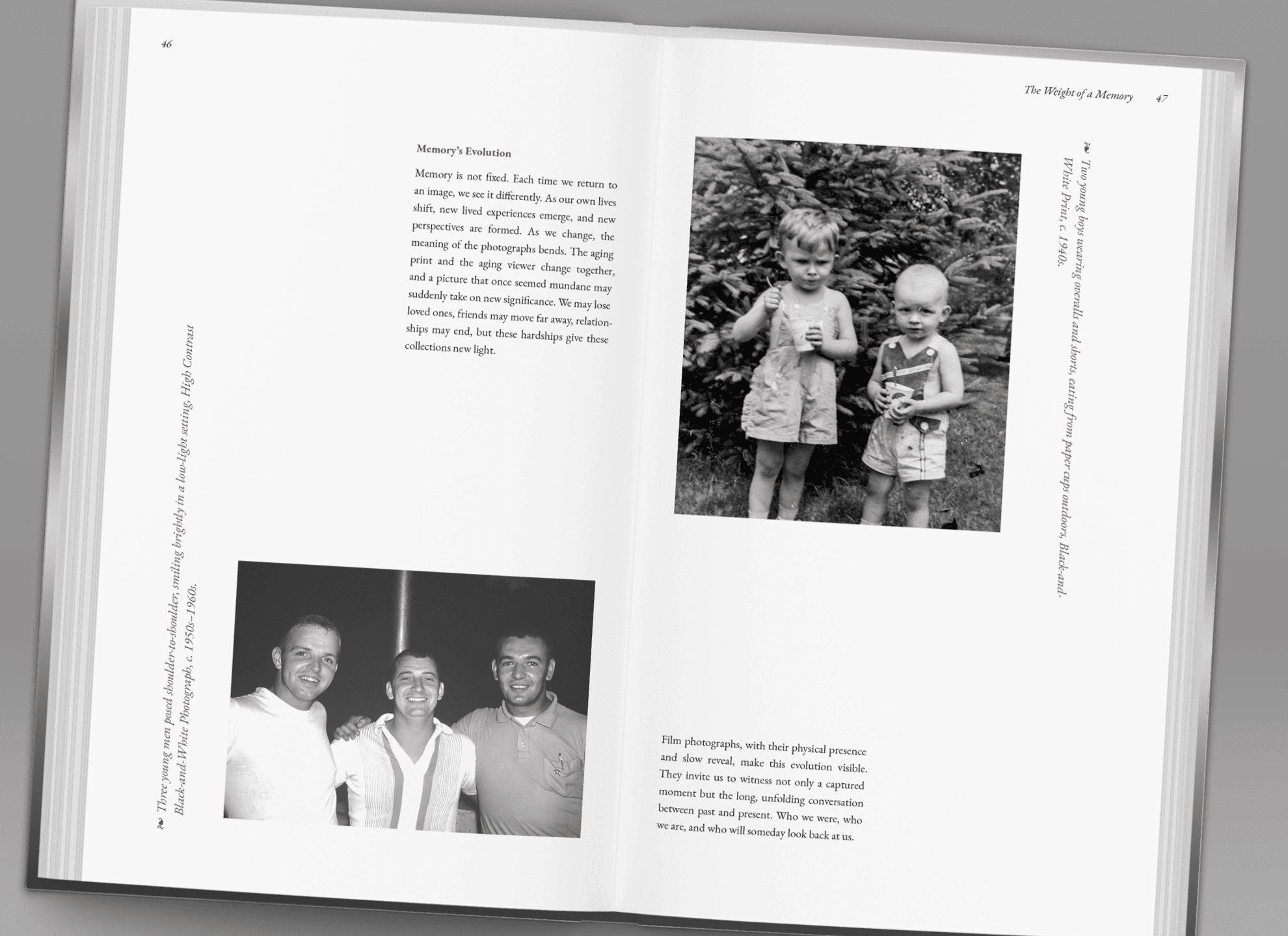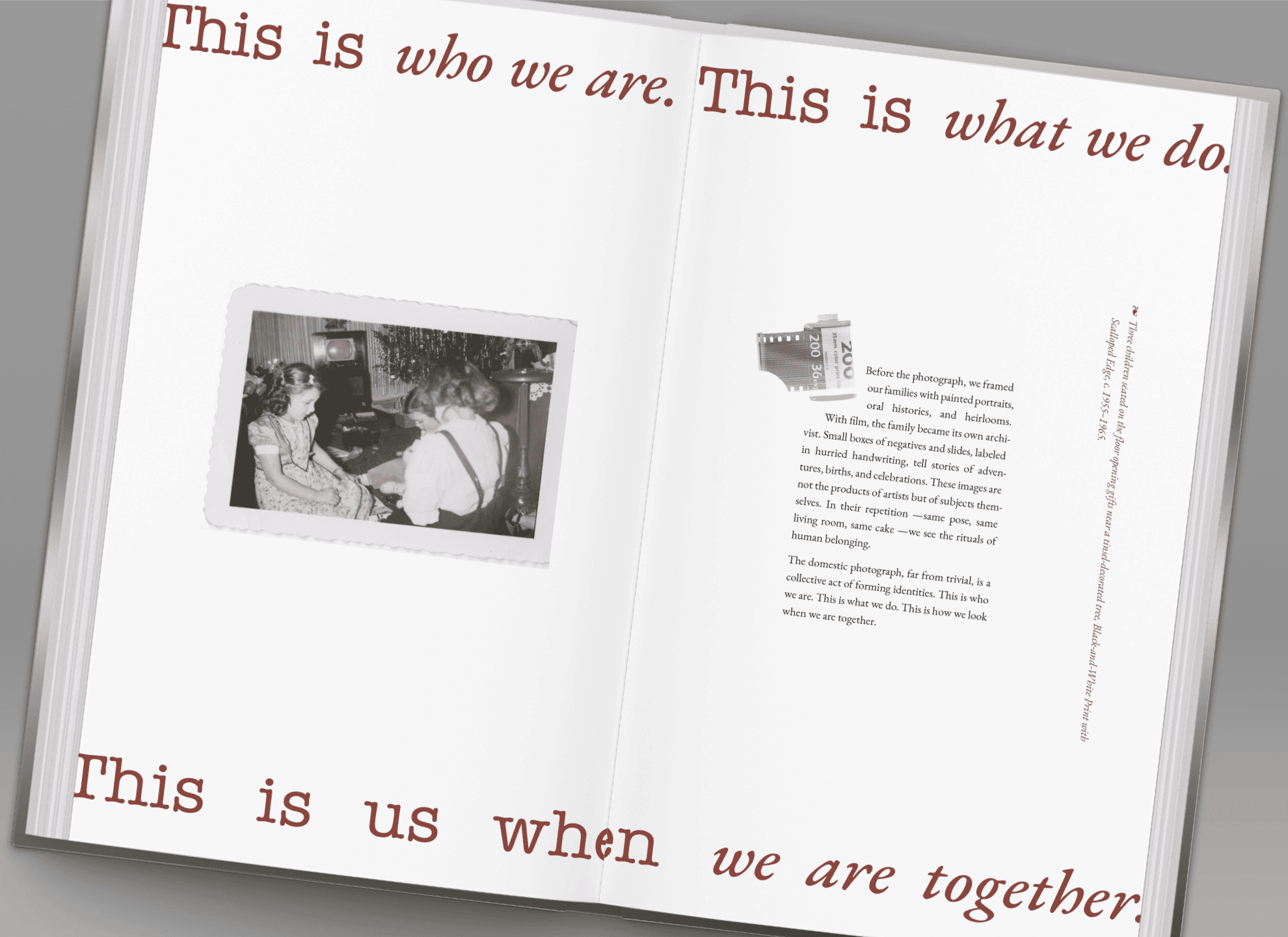 The book creates an archive of poignant memories and human connections through interactive found film photography, evocative questions, and insightful quotes carefully put together to more than a designed layout but rather a narrative inspired by a fascination with the novelty and reminiscent nature of film photography, especially as it relates to our core memories of family, childhood, and celebratory moments.