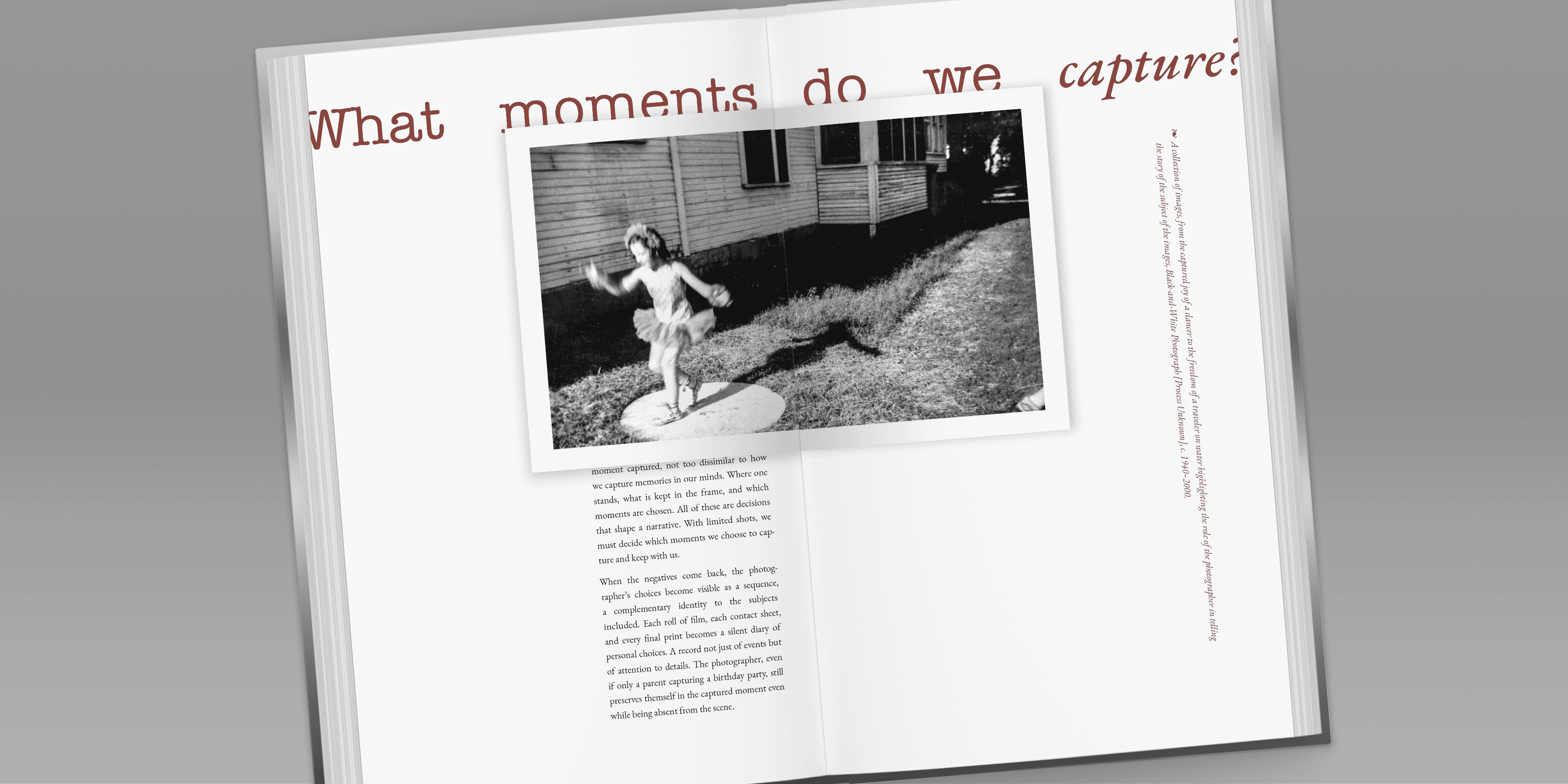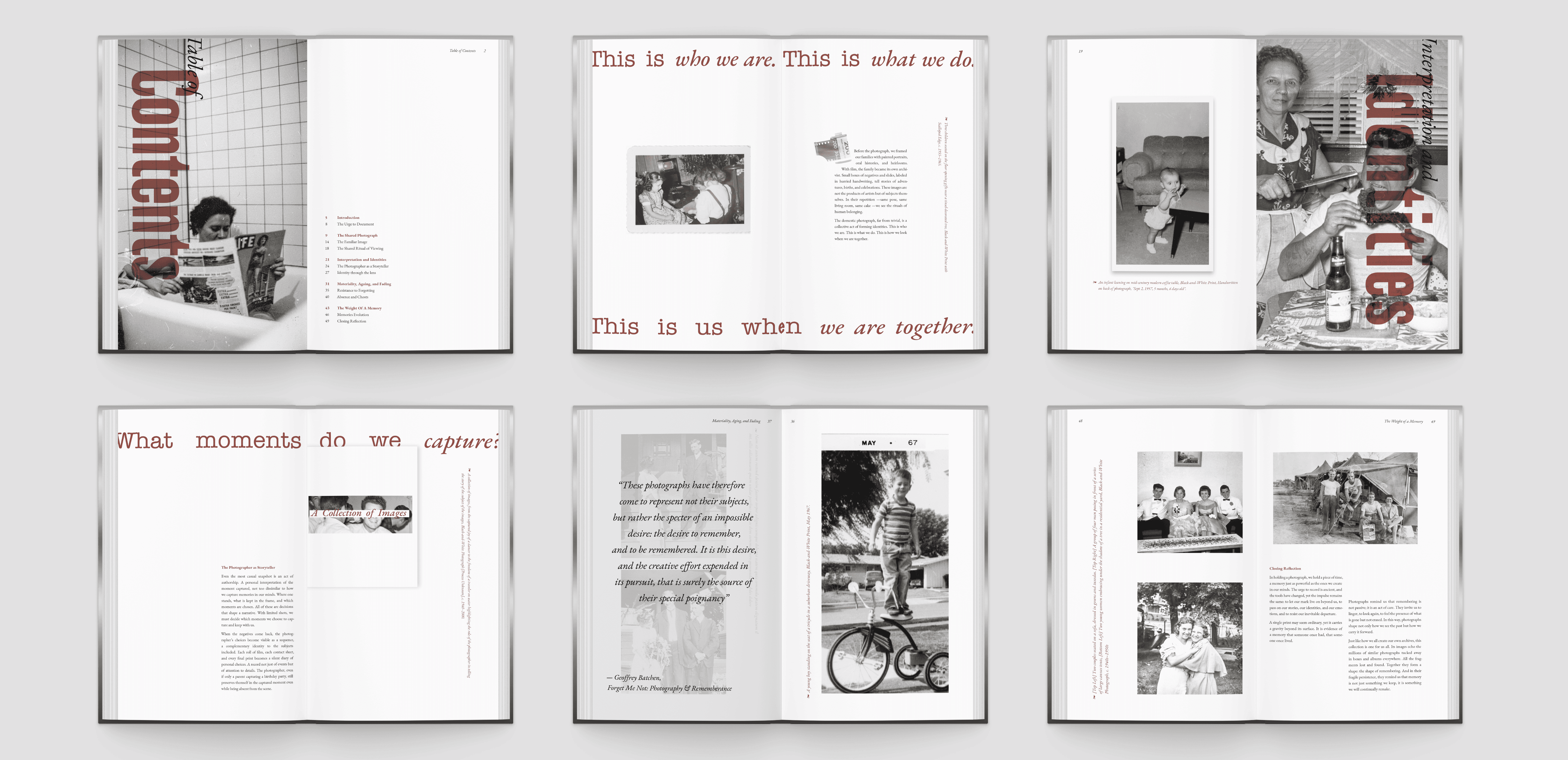 The book was crafted through an iterative layout exploration process, where various unique pages were drafted and narrowed down into a set of dynamic page compositions. Once a system of grids, fonts, and image treatment was established, it was then built out, eventually bringing in copy and rearranging imagery to create a full narrative. The cover, spreads, and other interactive elements were constructed into print-ready files, where they were printed, trimmed, and bound into a fully constructed book. Together, this interactive book was meticulously designed and constructed from the selected images to the precise trimming and binding, making it more than just a coffee table book.