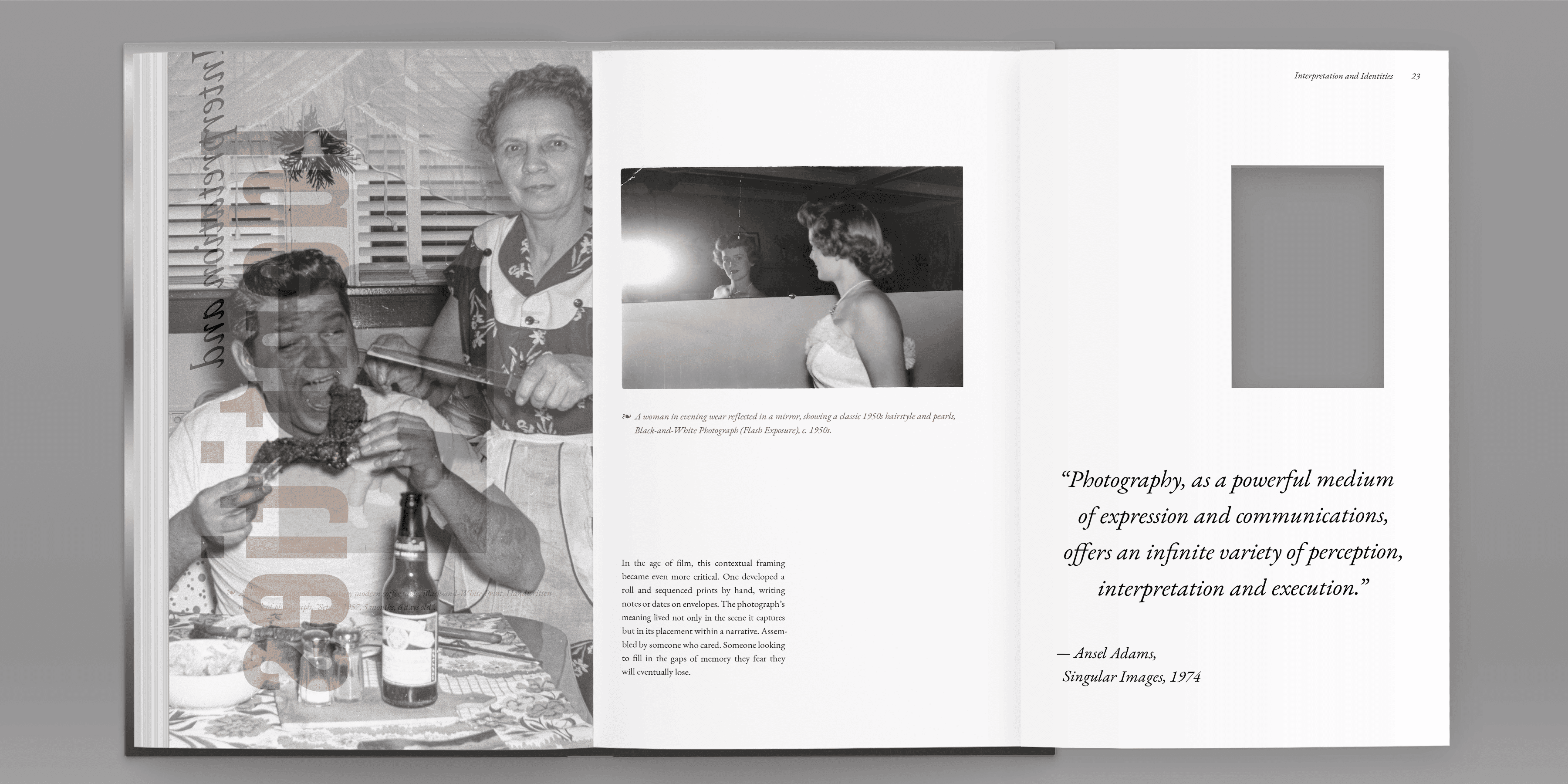 The final piece boasts French-folded pages bound together using Chicago screws, faced with a hard cover and endpapers. Each section begins with a translucent vellum header page and image drop-cap that references several film photography novelties, such as lens filters, film slides, and film canisters. Included are tipped-in prints of found photographs as well as other interactive elements such as fold-out and die-cut pages and a shortsheet booklet of additional images.